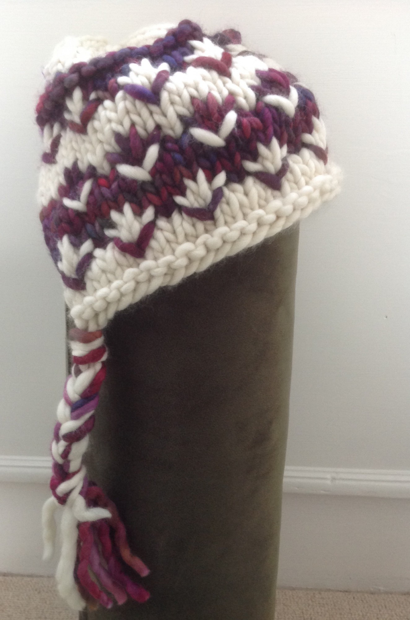 100% hand dyed Malabrigo chunky wool. Hand wash cold, size small/medium, child/ teen. Pattern by Wanded. See under murals and woollens for back view photo and other designs. One off piece would make a lovely unique gift.