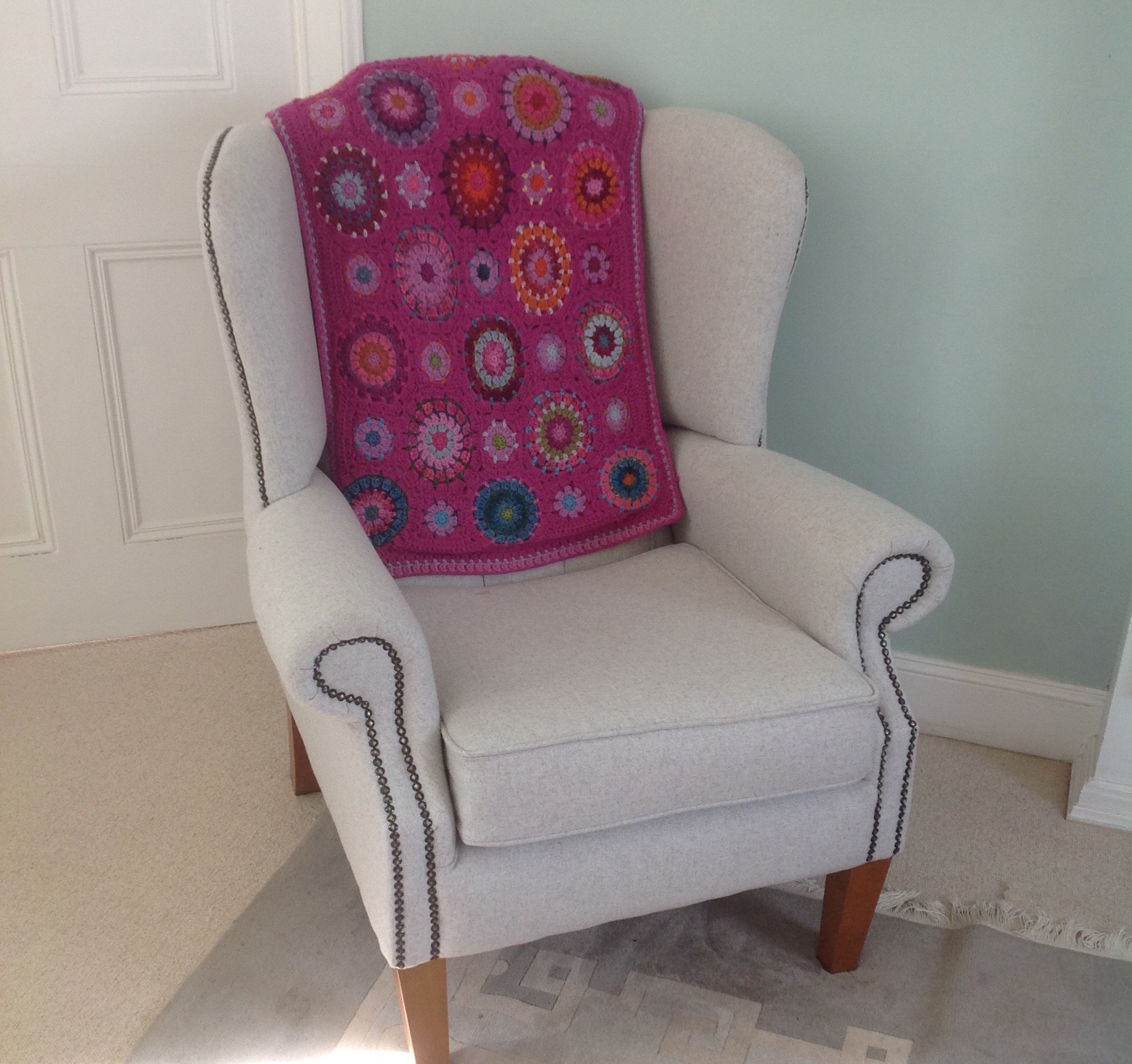 Crochet circles designed in any colours to suit your room. Uplift an old chair, or over the knee, very warm, wool, gentle hand or cool machine wash. Made to order in any size. Example shown 52 x 90 cm £125 100% wool.