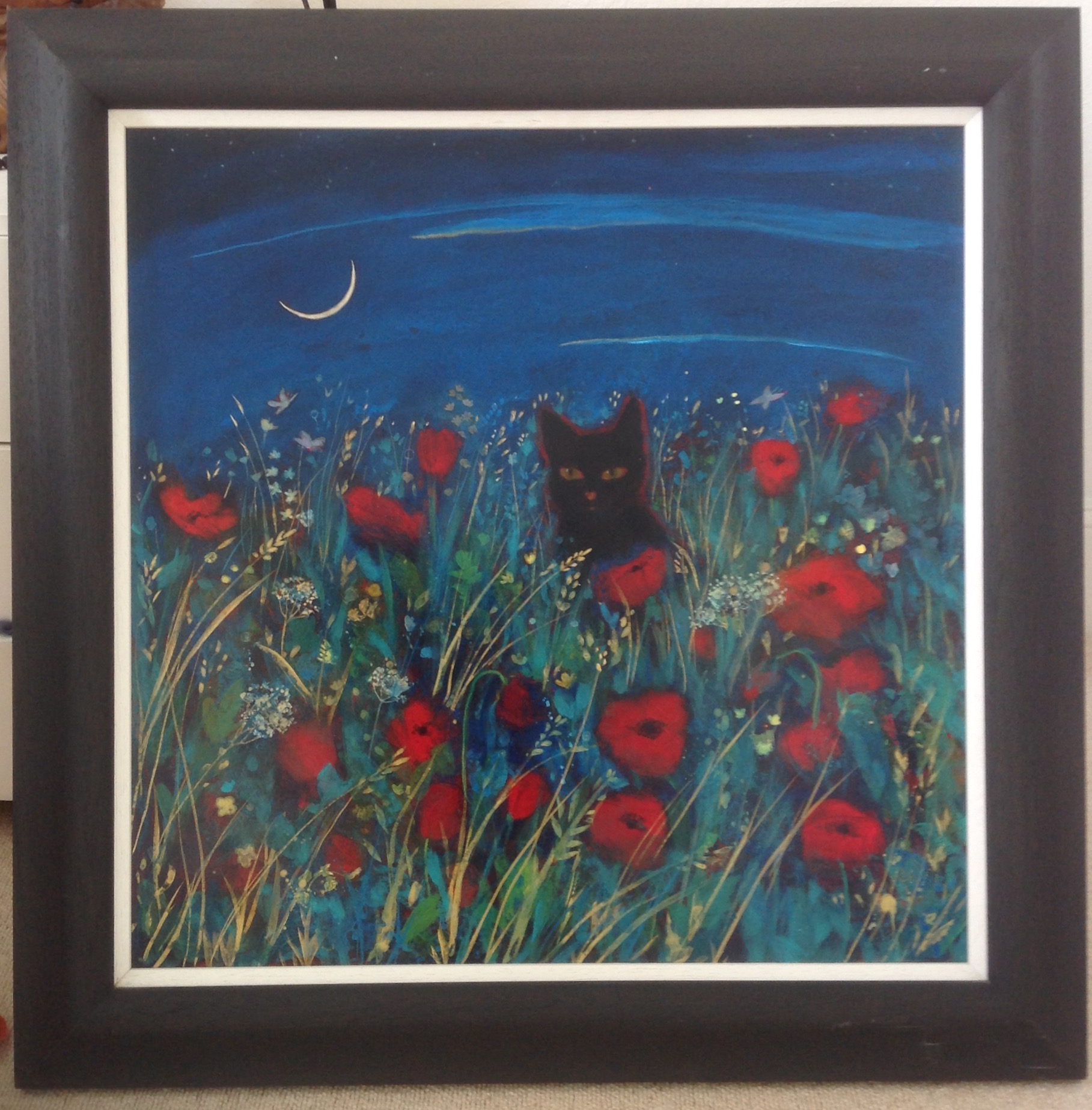 SALE price. Acrylic on board image size 59 x 59 cm wooden frame size 75 x 75 cm. substantial solid frame painted in dark charcoal. May need to be delivered/collected as possibly a bit heavy for posting. Nice painting for a lover of cats.